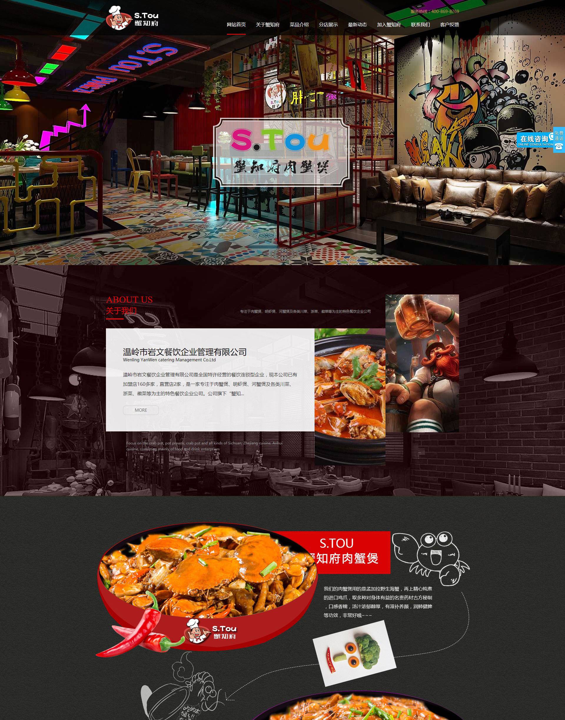 溫嶺市巖文餐飲企業管理有限公司是全國特許經營的餐飲連鎖型企業,現本公司已有加盟店160多家,直營店2家,是一家專注于肉蟹煲、明蝦煲、河蟹煲及各類川菜、浙菜、徽菜等為主的特色餐飲企業公司。公司旗下“蟹知府肉蟹煲“.“S.TOU胖子肉蟹煲”在國內是較知名的餐飲品牌。2008年5月,浙江海鹽一位廚師與螃蟹有了第一次的親密接觸,從此便不可收拾的愛上了肉蟹煲。