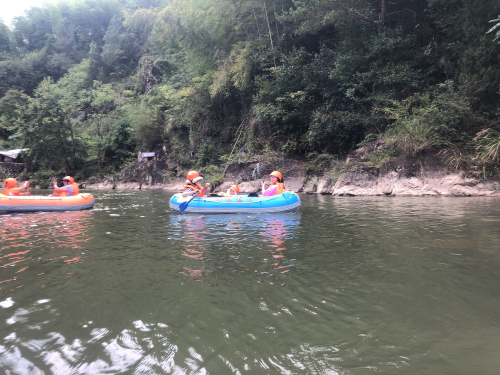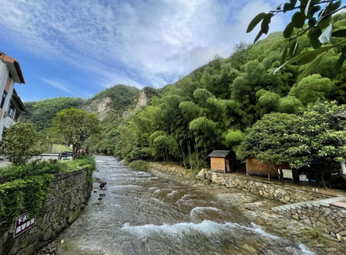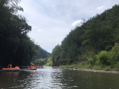 群山環抱,溪水清澈見底,漂流途中兩岸山林連綿起伏,郁郁蔥蔥,