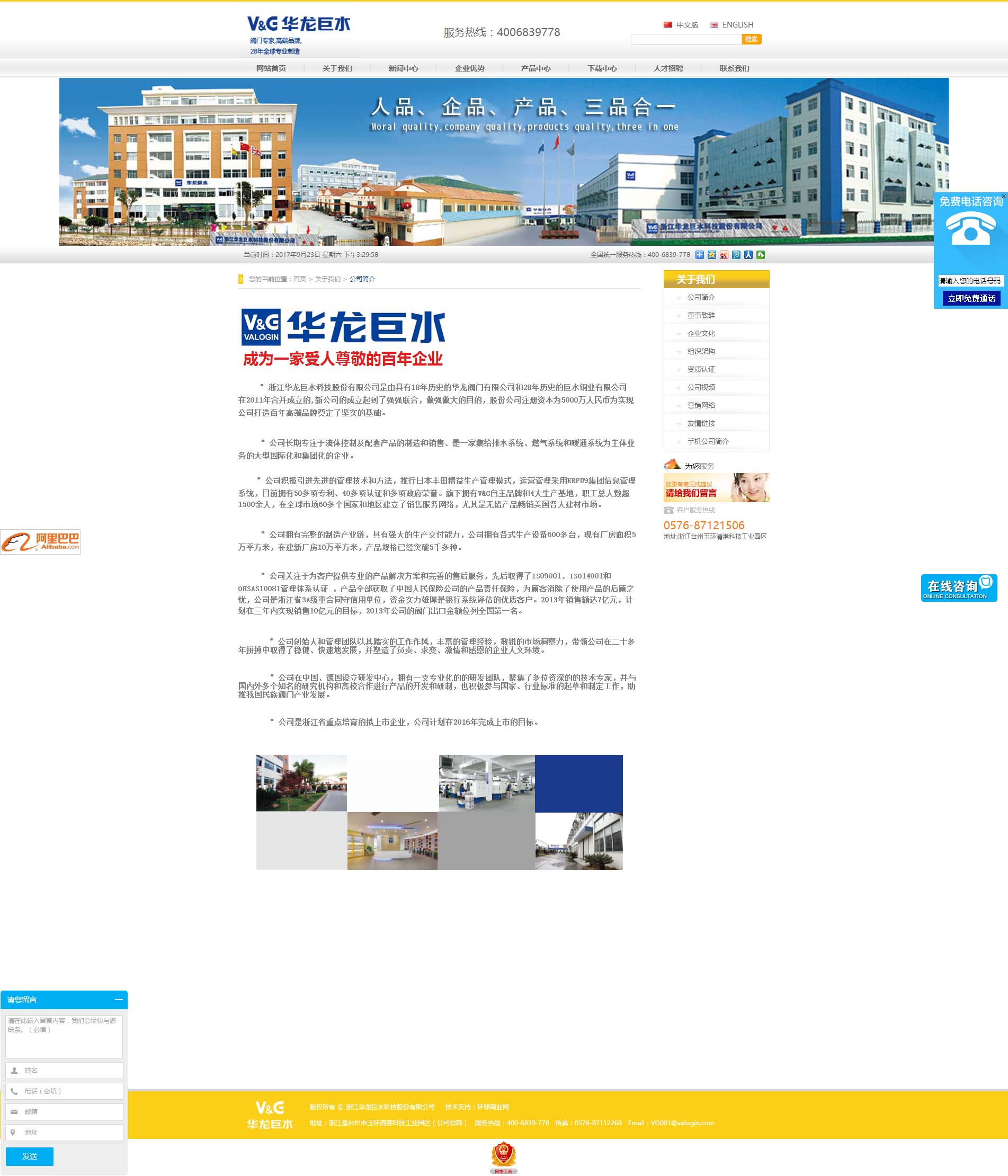 浙江華龍巨水科技股份有限公司是由具有18年歷史的華龍閥門有限公司和28年歷史的巨水銅業有限公司在2011年合并成立的,新公司的成立起到了強強聯合,做強做大的目的,股份公司注冊資本為5000萬人民幣為實現公司打造百年高端品牌奠定了堅實的基礎。