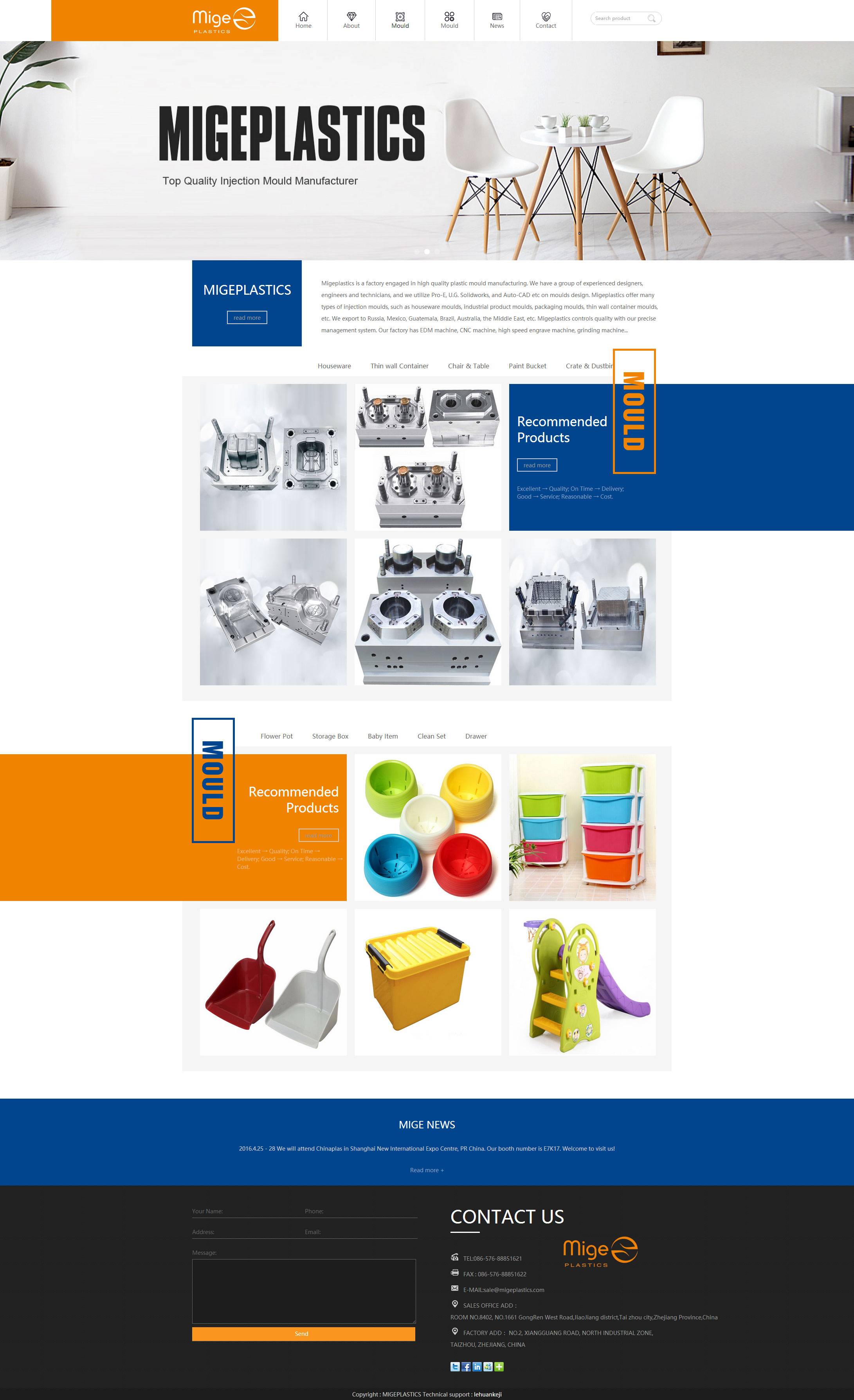 Migeplastics is a factory engaged in high quality plastic mould manufacturing.We have a group of experienced designers,engineers and technicians,and we utilize Pro-E,U.G.Solidworks,and Auto-CAD etc on moulds design.Migeplastics offer many types of injection moulds,such as houseware moulds,industrial product moulds,packaging moulds,thin wall container moulds,etc.We export to Russia,Mexico,Guatemala,Brazil,Australia,the Middle East,etc.