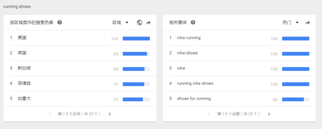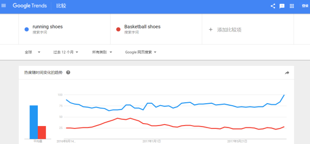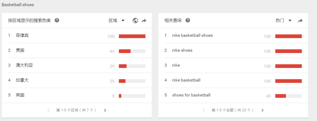 以running shoes 和basketball shoes 為例running shoes 的熱度在谷歌上遠超basketball 這時候我們可以把running shoes 為我們主要去搜索的關鍵詞。