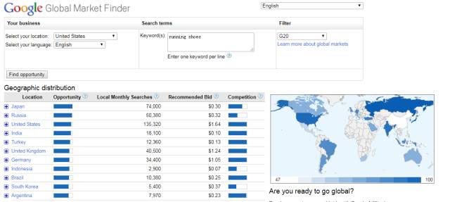 全球商機洞察可以提供來自全球互聯網搜索的數據。按照總的搜索量、建議出價和競爭狀況對每個市場的商機進行排序。