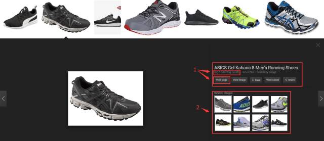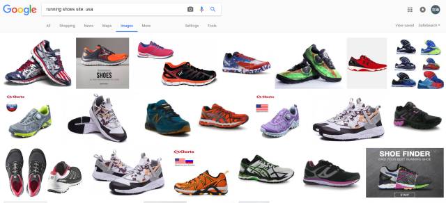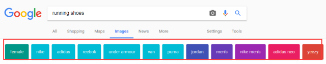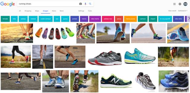 輸入“running shoes”,就會出現各種跑鞋,眼花繚亂。往下看在圖片結果的上端出現了一條不同顏色的單詞條,這是Google推薦的篩選細分類目。