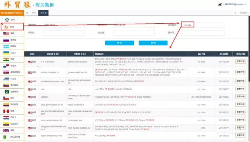 打開了海關數(shù)據(jù),這里共有52個國家+兩個地區(qū),共54個,選擇對應國家或地區(qū)(PS:現(xiàn)在外貿(mào)狼升級了,可以直接一鍵查詢?nèi)虻目蛻簦┲螅梢杂秘浧访枋鏊阉鳎部梢杂貌少徤獭⒐虂碇苯铀阉鳎ㄗh用大詞,寬泛一些詞來搜,如下,我使用關鍵詞“pp rope”搜索客戶,如下: