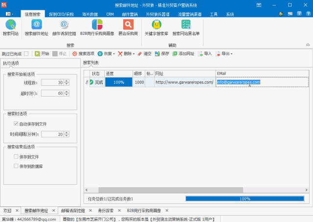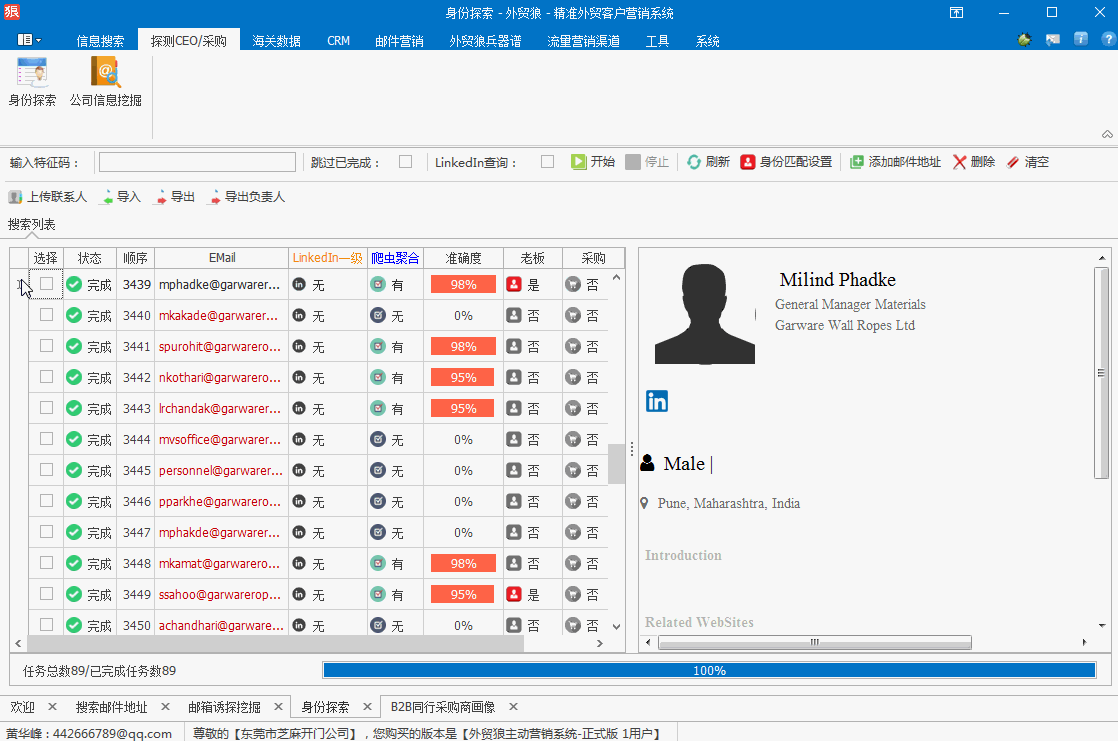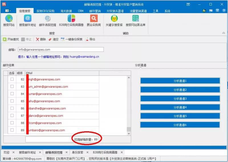 利用外貿(mào)狼的深度挖掘功能和搜索引擎爬蟲技術,快速挖掘出企業(yè)的89個企業(yè)郵箱。