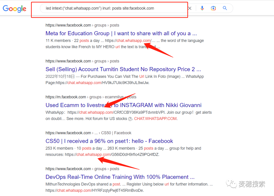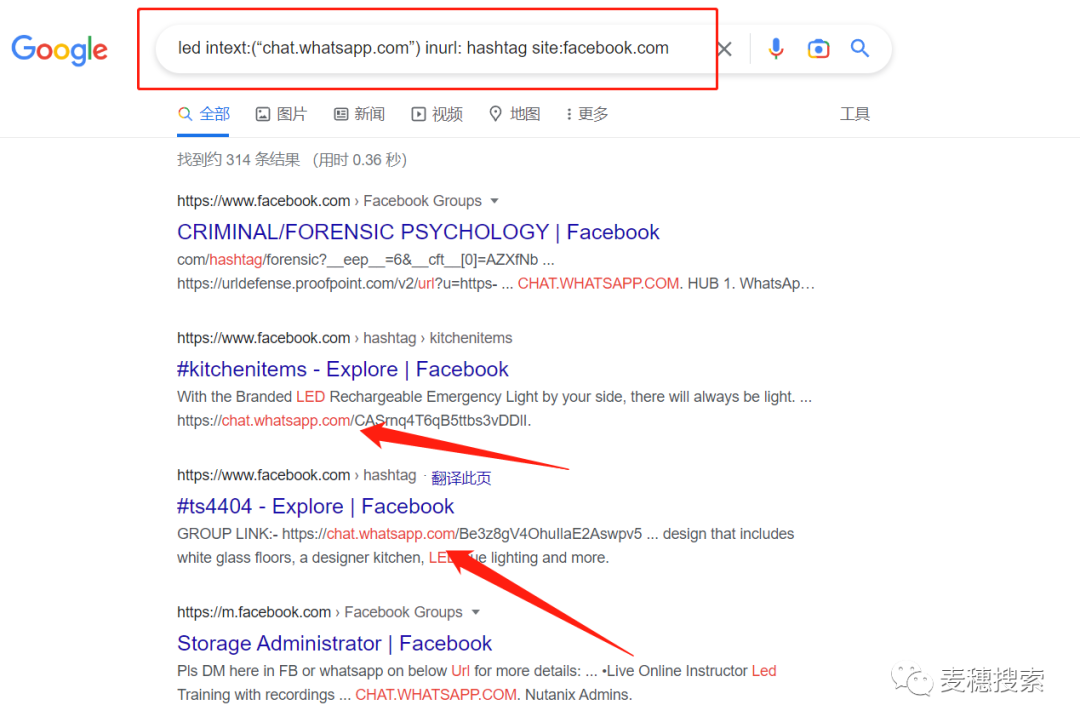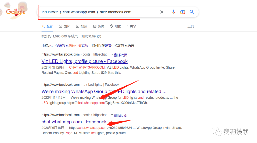 想要更細節的話,可以從Facebook的帖子中搜索,可以輸入:led intext:(“chat.whatsapp.com”)inurl:posts site:facebook.com