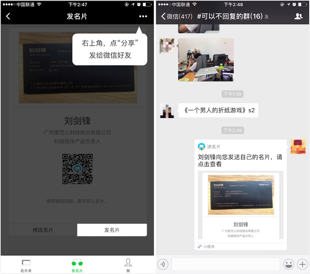 將自己的名片,通過微信分享給對方。在微信群中,一鍵收集所有人的名片,并向對方分享自己的名片。與對方見面時,互相掃描對方的名片二維碼。